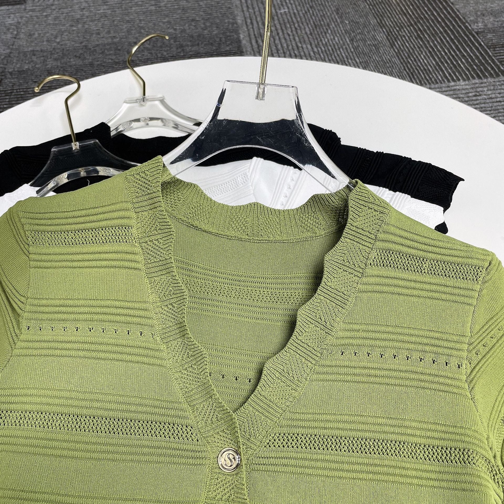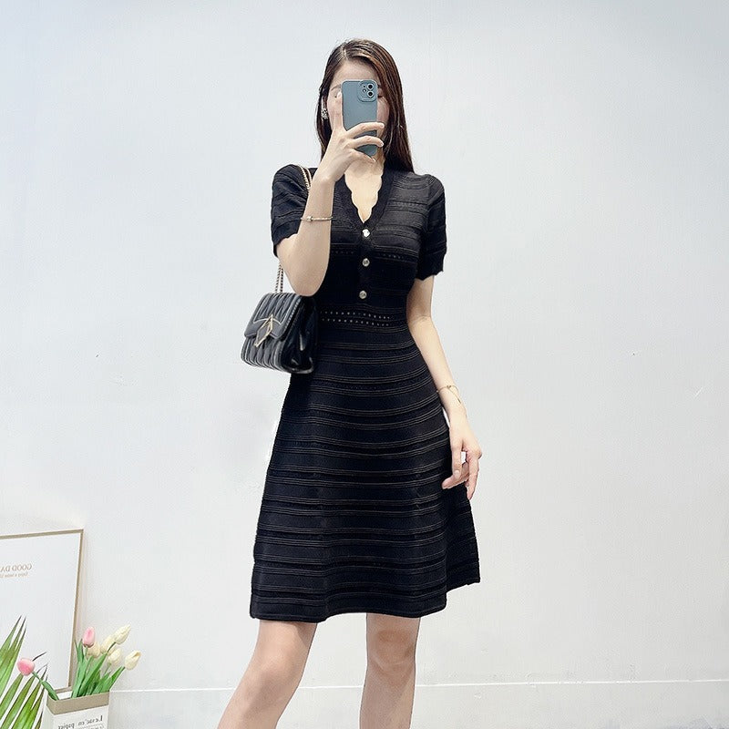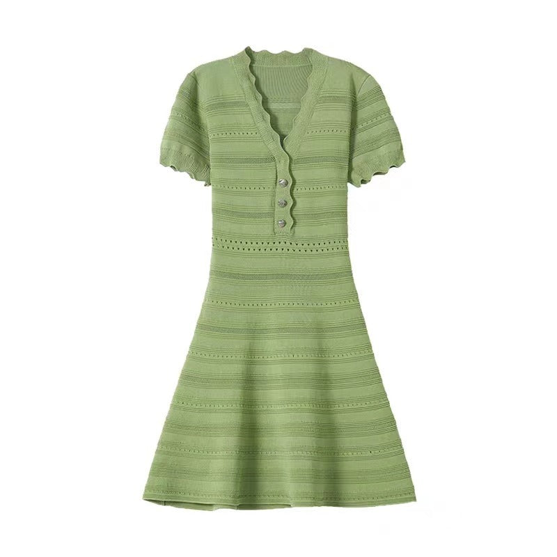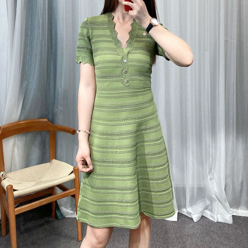 فستان أخضر راقي، فستان محبوك برقبة على شكل حرف V، ملابس نسائية صيفية فرنسية، إحساس راقي، مكانة، فاخرة خفيفة