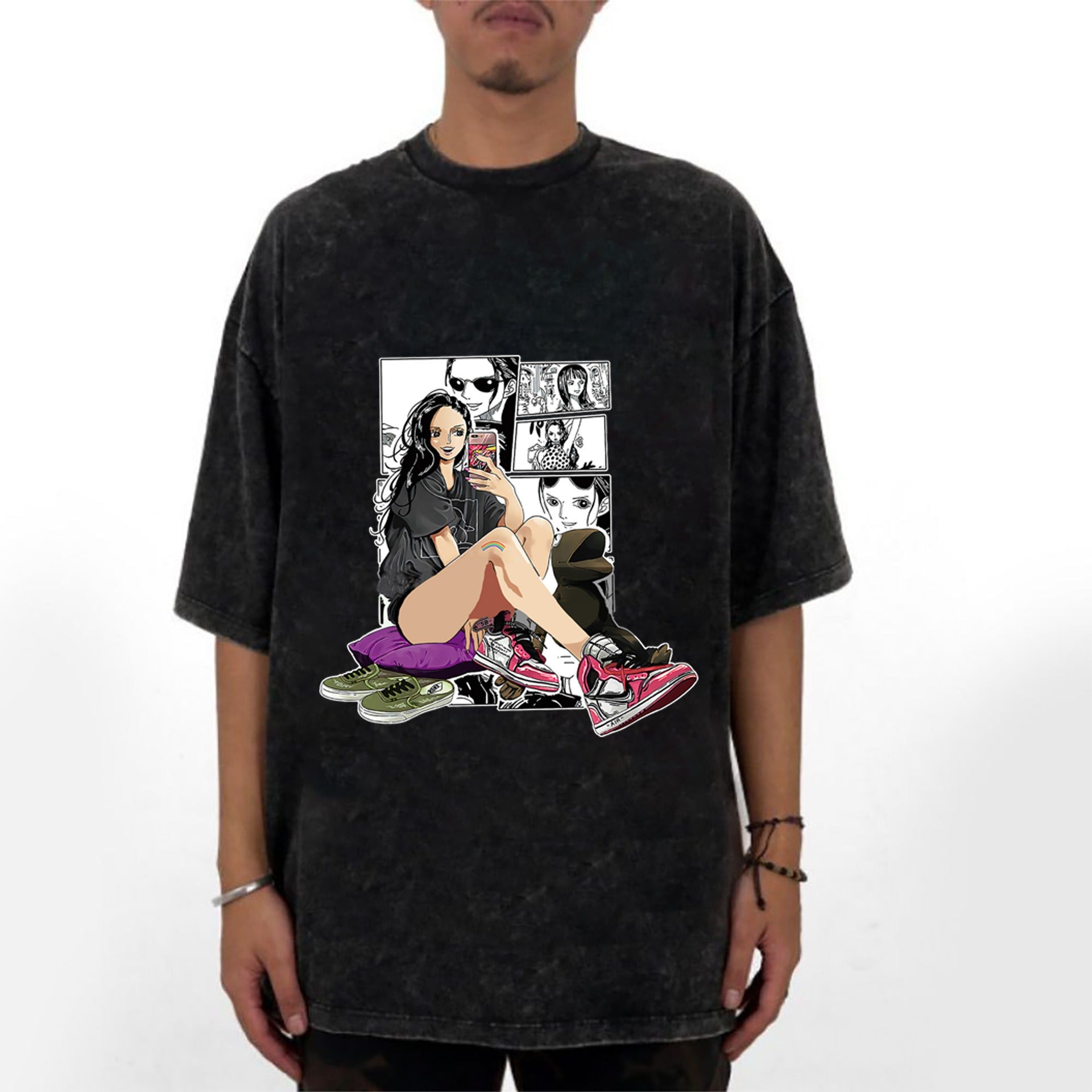 Washed old pirate king Robin short sleeved T-shirt for men and women, summer youth student fashion label