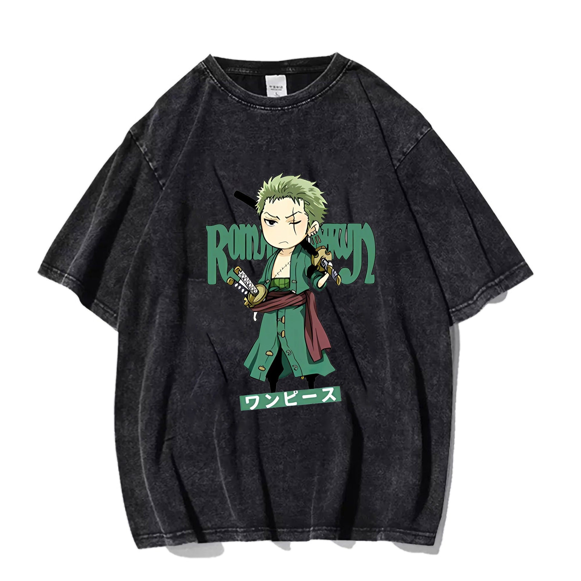 Washed Old T-shirt Luffy Short Sleeve Summer King Pirate Straw Hat T-shirt Co branded Men's and Women's Pure Cotton Print