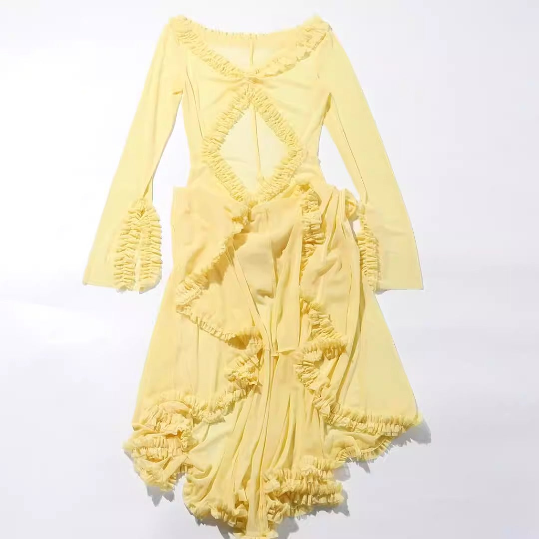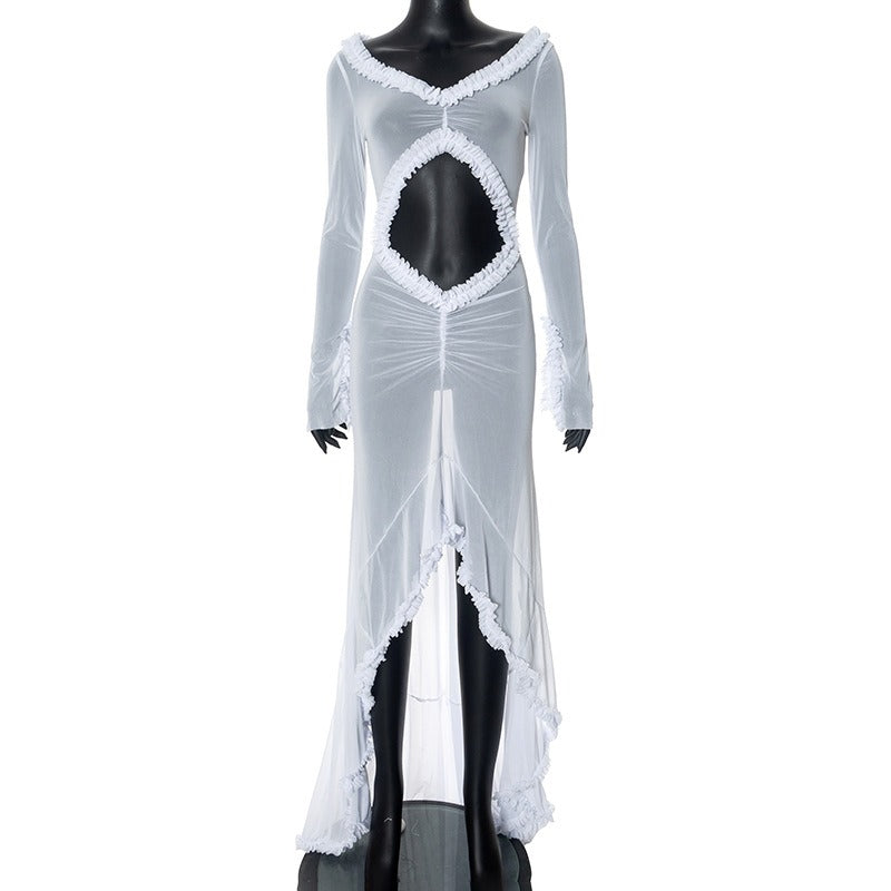 New Solid Color Long Sleeve Perspective Low cut Sexy Dress
