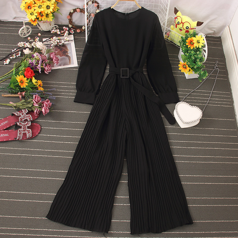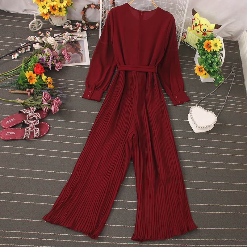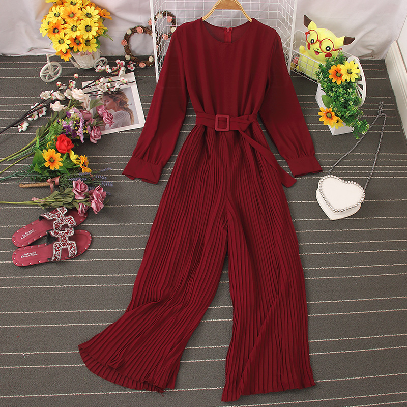 Elegant round neck, long sleeves, waistband, tie up for slimming, pleated wide leg long pants, jumpsuit for women